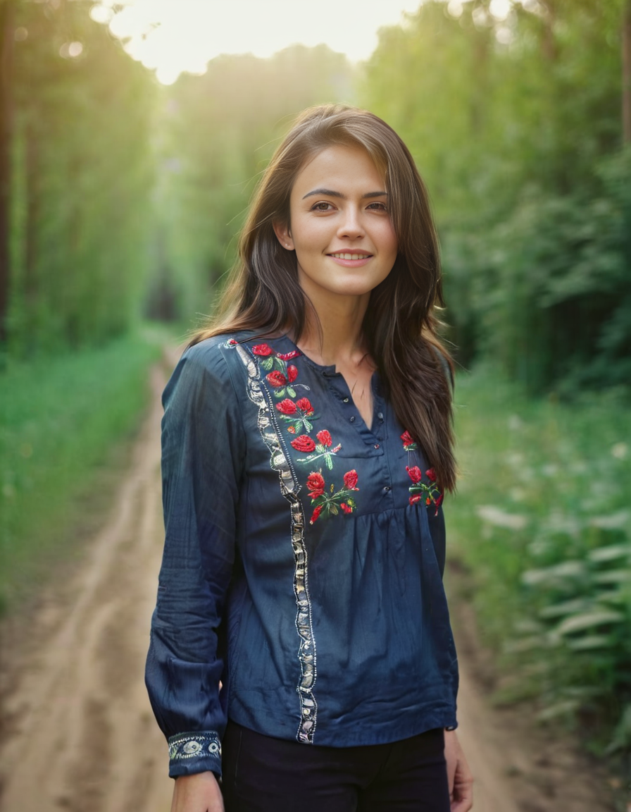 AparnaDas,<lora:AparnaDasSDXL:1>cinematic photo happy woman, long layered haircut, brunette hair, long sleeve blouse with embroidered stripes, standing on an old dirt road leading into a forest . 35mm photograph, film, bokeh, professional, 4k, highly detailed