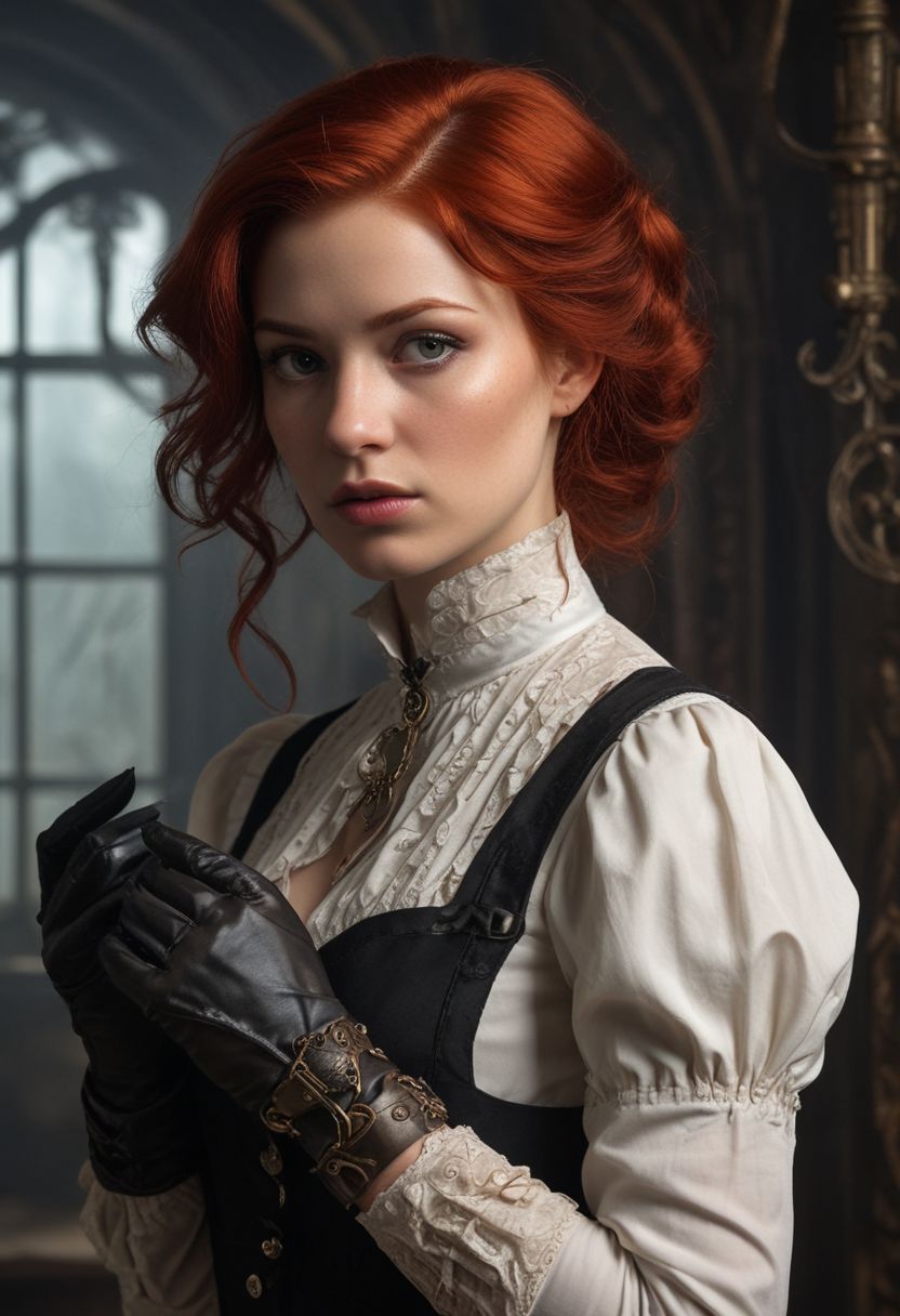 Close Up shot, redhair Female Young angel, (style-swirlmagic:0.8), solo, upper body, looking away, detailed background, detailed face, (victorian theme:1.1), false confidence, investigator of the unknown, tattered adventuring gear, gloves, dark color scheme, ancient apocalyptic prophecy,,psychological struggle, antique glyphs, shadowy tendrils in background, low light, early 20th century mysterious Lovecraftian atmosphere,