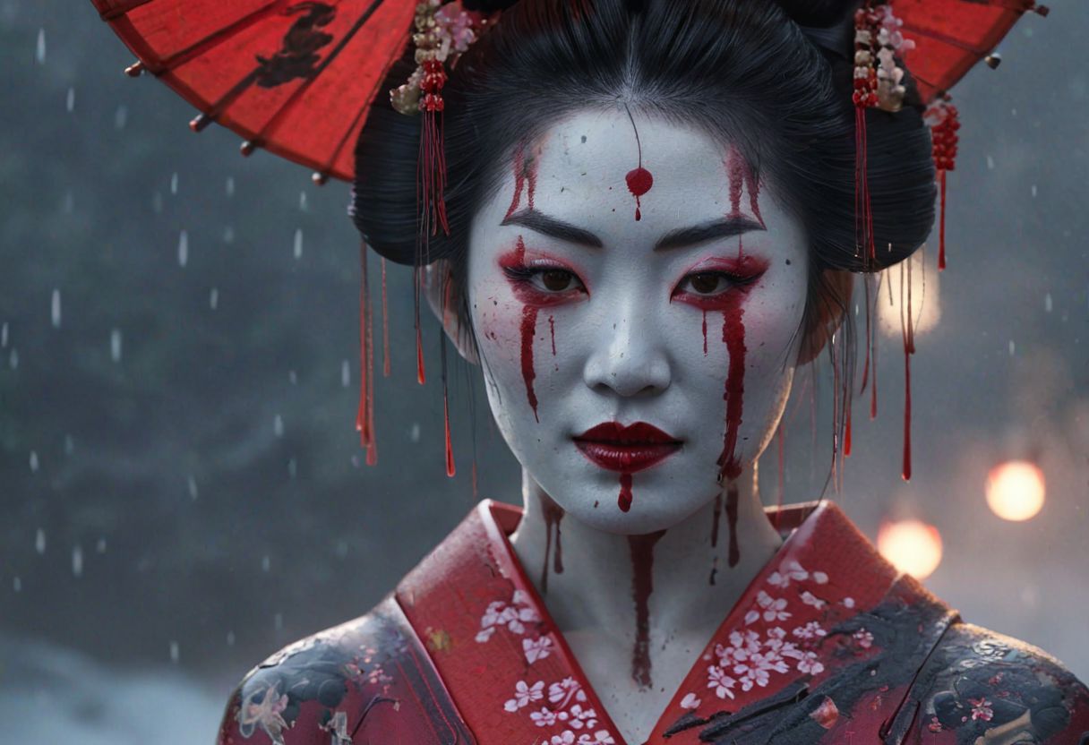 Geisha, ((beautiful)), Vampire, Ancient Japan, Portrait, Full body, Firefly lights, Tattoo, Spring, Frost, Foggy, High angle, Photorealistic, Cinematic, High quality, Ultra realistic, Hyper detailed, 4k, blood on face, bleeding, epic, blood dripping, bloodyface, blood, bleeding, (smile:0.4), Hyperrealism style