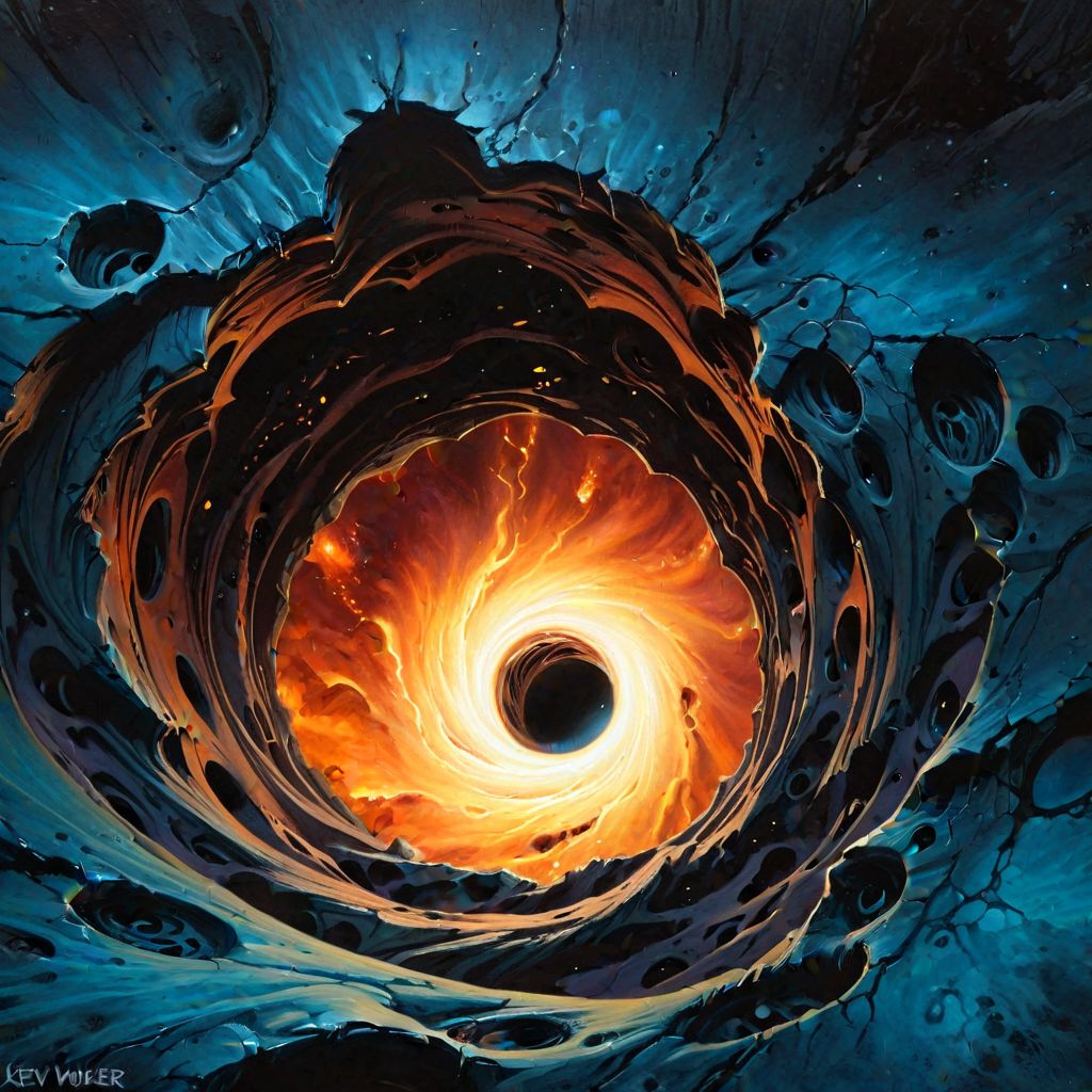 fantasy painting, closeup, dark cave, dramatic, black hole, gravity, magical light swirls, detailed, evoKevWalker, by kev walker