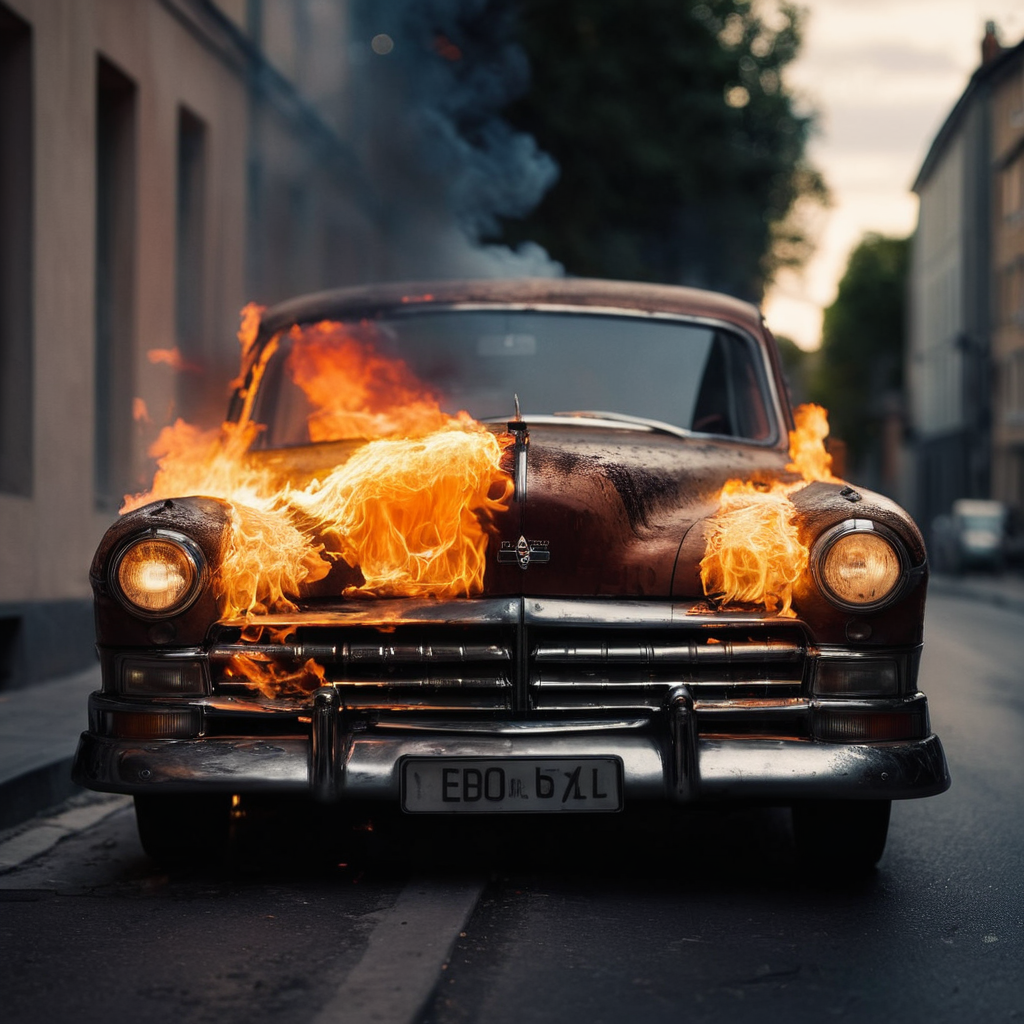 cinematic film still of <lora:perfection style:0.9> wrinkles:1 A perfect photo of a car is on fire in a street, perfection style, shallow depth of field, vignette, highly detailed, high budget, bokeh, cinemascope, moody, epic, gorgeous, film grain, grainy