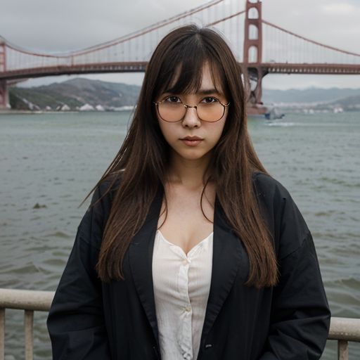long shot, Chinese woman, Age: 19, bangs, long hair, (rectangular glasses), neutral expression, oval face, straight hair, bags under eyes, chubby, no pale skin, no heavy makeup, no high cheekbones, no rosy cheeks, no sideburns, no mouth open, san francisco bay background, golden gate bridge