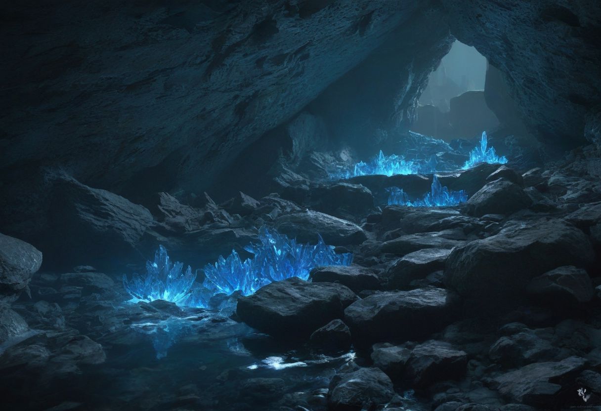 best quality,(inside a cave:1.3), the inner top of the chamber is (arched). a small cluster of light blue crystals are growing from the ground, gently glowing. Around the crystals there are rock walls, and a tiny stream flowing by, ((a large slice) of rock bed on the other side), creating a tranquil and breathtaking scenery. Dark environment, realistic, detailed texture.