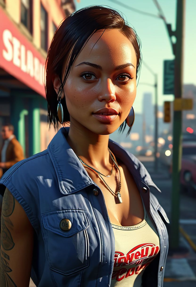 "Grand Theft Auto Five" style. "Levy Tran". In a "Grand Theft Auto Five Loading Screen" aesthetic. Stares the viewer. Subtle smile. Strong expression. Confident. Hip-Hop outfit. By "Simon Stalenhag". Life-like details. Cinematic. Dramatic. Dynamic. Extremely refined lines and and shapes. Extremely refined details on objects. Sharp details. Wide range of colors. Many details everywhere. Ray-Tracing. Anti-Aliasing. Realistic soft shadows. Low saturation colors. Insane quality. Insane resolution. Insane details. Masterpiece. 32k resolution.