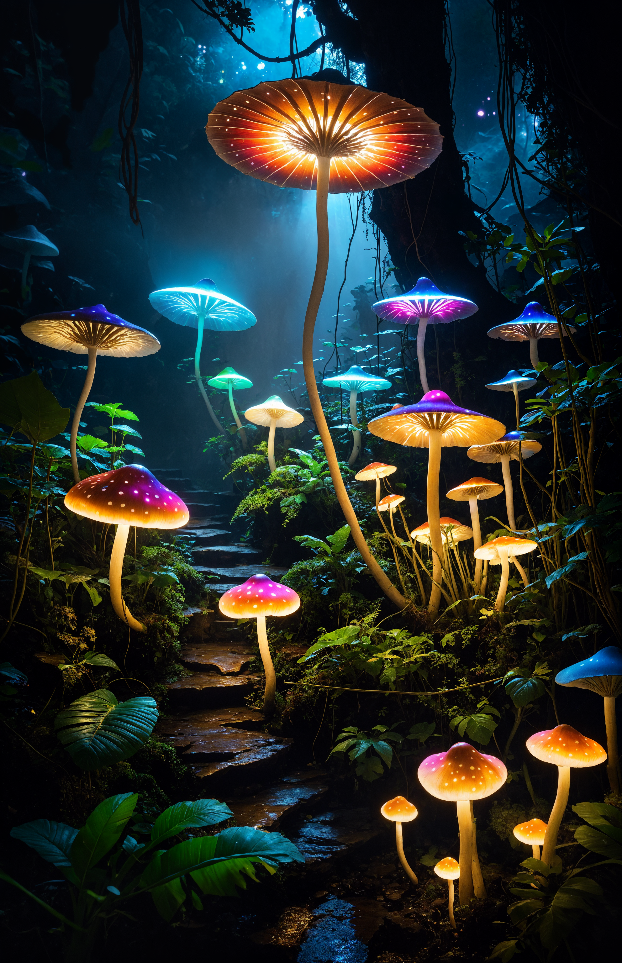 Fluorescent light: Various strange-shaped plants emit colorful light, lighting up the night of Pandora, like a dreamy starlight world. Biodiversity: Various strange and beautiful plants come in different shapes, some are like giant mushrooms, some are like dancing flowers, and some are like glowing vines, showing the amazing biodiversity of Pandora. Strong vitality: These plants grow luxuriantly and are full of vitality, as if they are telling the vitality of Pandora. Mysterious atmosphere: The Pandora planet at night is full of mysterious atmosphere. Unknown creatures and strange plants make people full of curiosity and awe. Dreamy scene: The whole scene is full of dreamy colors, making people feel like they are in a science fiction movie. Scene details: Huge Mushroom Umbrella: The huge and strange mushroom umbrella blocks out the sky and is covered with luminous spots, like small lanterns, illuminating the surrounding plants. Dancing flowers: The dancing flowers sway gently in the breeze, with colorful lights flashing on their petals, as if they are dancing for Pandora at night. Glowing vines: Slender vines wrap around the branches, like glowing ribbons, twisting and turning in the dark, adding a bit of mystery. Unknown Creatures: There are strange calls in the distance, as if there are unknown creatures lurking in the dark, making people full of curiosity and fear. Dreamy fog: A thin fog envelopes the entire scene, adding a bit of dreaminess and making Pandora even more mysterious. visual effect: Brilliant colors: The picture is colorful, and the colorful lights are intertwined to create a dreamlike atmosphere. Exquisite details: The details of the picture are exquisite, and every plant is vividly depicted, showing the amazing biodiversity of Pandora. Light and shadow effects: The clever use of light and shadow effects makes the picture more layered and has a strong three-dimensional effect. Mysterious atmosphere: The whole picture is full of mysterious atmosphere, making people feel like they are in an unknown world.