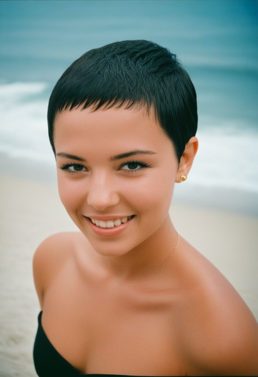 young woman, 18 years old, <lora:A_SHort_Cut_v3_SDXL:1.2>, (very short hair:1.2), (buzz cut:1.2), , black hair, smirking, upper body, half body shot, overhead shot, face the camera, looking at viewer, monochrome, sharp contrasts, tropical beach backdrop,1968, 60s, photoshoot, RAW photo, editorial photograph, film stock photograph, cinematic, posing, amateur photo, analog, raw, f2, 35mm, an (amateur photo), flash photography, taken on an old camera, polaroid, 8k, highly detailed, (high quality, best quality:1.3), Extremely high-resolution, film grain, ((macro lens)), dark atmosphere, ((focused on eyes)), feminine expressions, photography, dslr, 35mm, Fujifilm Superia Premium 400, Nikon D850 film stock photograph, Kodak Portra 400 f1.6 lens, 8k, UHD