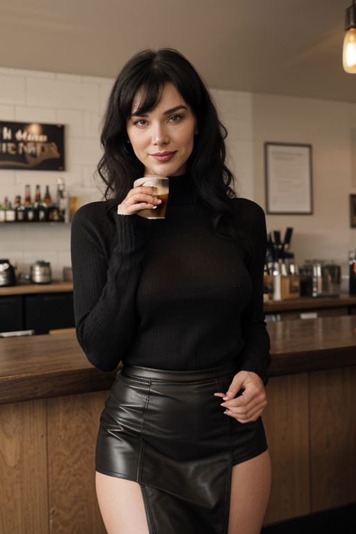 Beautiful 30 years old bettie page, makeup, olive skin, curly black hair (middle lenght), posing seductively in coffee shop, waitress drinking a glass of beer, ,daylight seductive smile, black silk sweater, black leather skirt, black gloves,high detail face, high detail clothes, ultrarealistic, dark shot, cinematic, professional photo