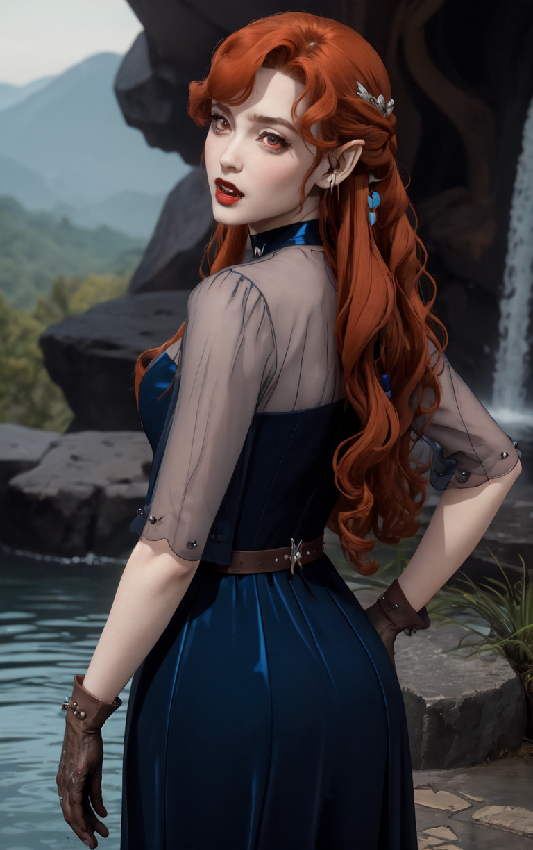 ((masterpiece, best quality)), insaneres, absurdres, solo, looking at viewer, BlueDress_Lenore_ownwaifu, 1girl, long hair, red eyes, blush, pointy ears, lips, breasts, red hair, hair ornament, braid, fangs, makeup, lipstick, black lips, vampire, very long hair, wavy hair, colored skin, blunt bangs, cleavage, dress, jewelry, gloves, blue dress, see-through, grey gloves, see-through sleeves, ring, long dress, belt, choker, bracelet, (wading, ass support), waterfall, <lora:CARTOON_Castlevania_Lenore_ownwaifu:0.75>, depth of field, vanishing point, garden, sidelighting,