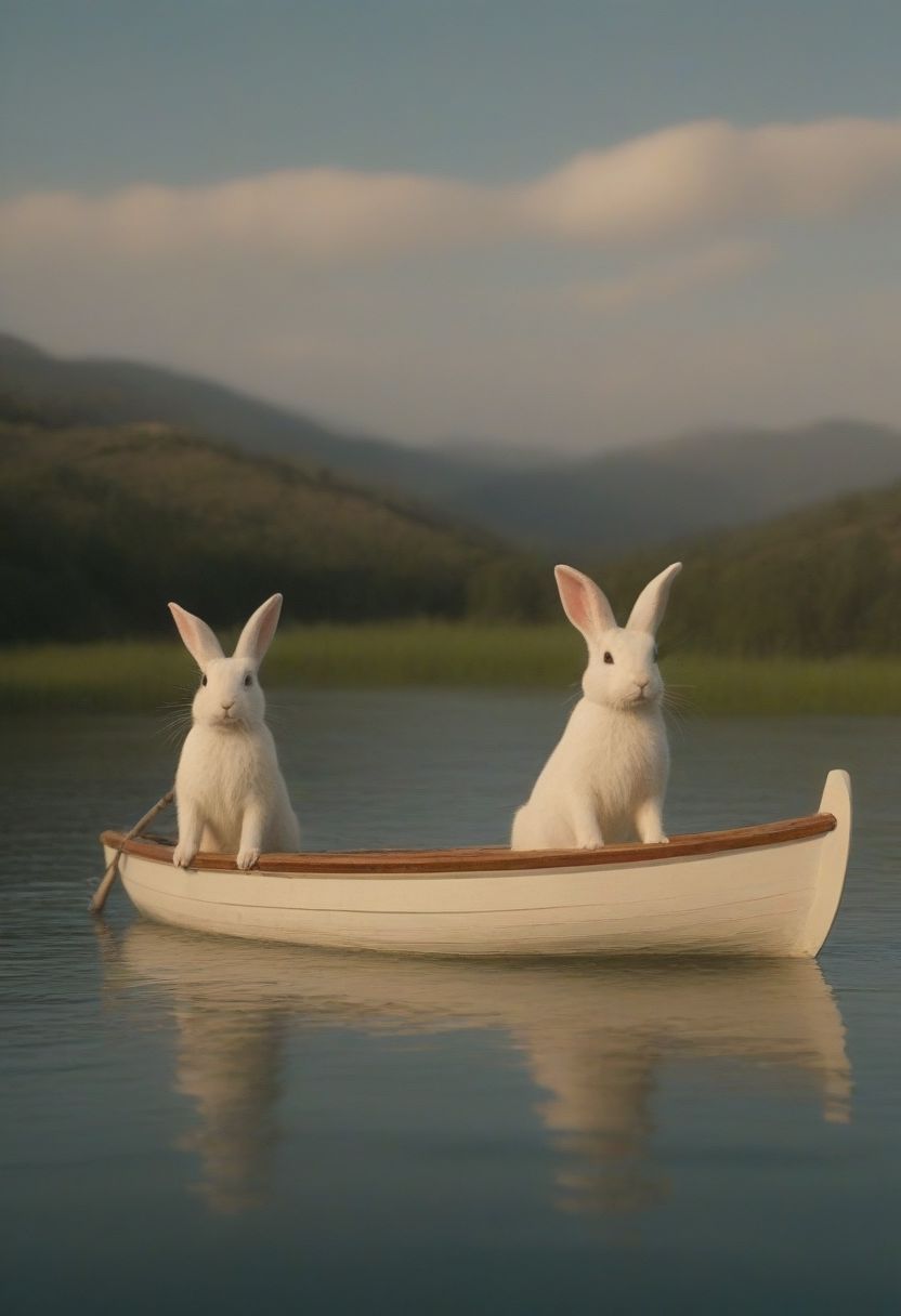 Whimsical scene with a pair of white rabbits rowing a boat surrounded by a beautiful landscape. The rabbits are positioned in the center of the scene, looking up at the sky. The landscape includes a body of water, such as a river or a lake, with a mountain in the background. Ultra-realistic award-winning film still, 8k, golden hour, subsurface scattering, volumetric lighting, sharp focus, warm lighting style