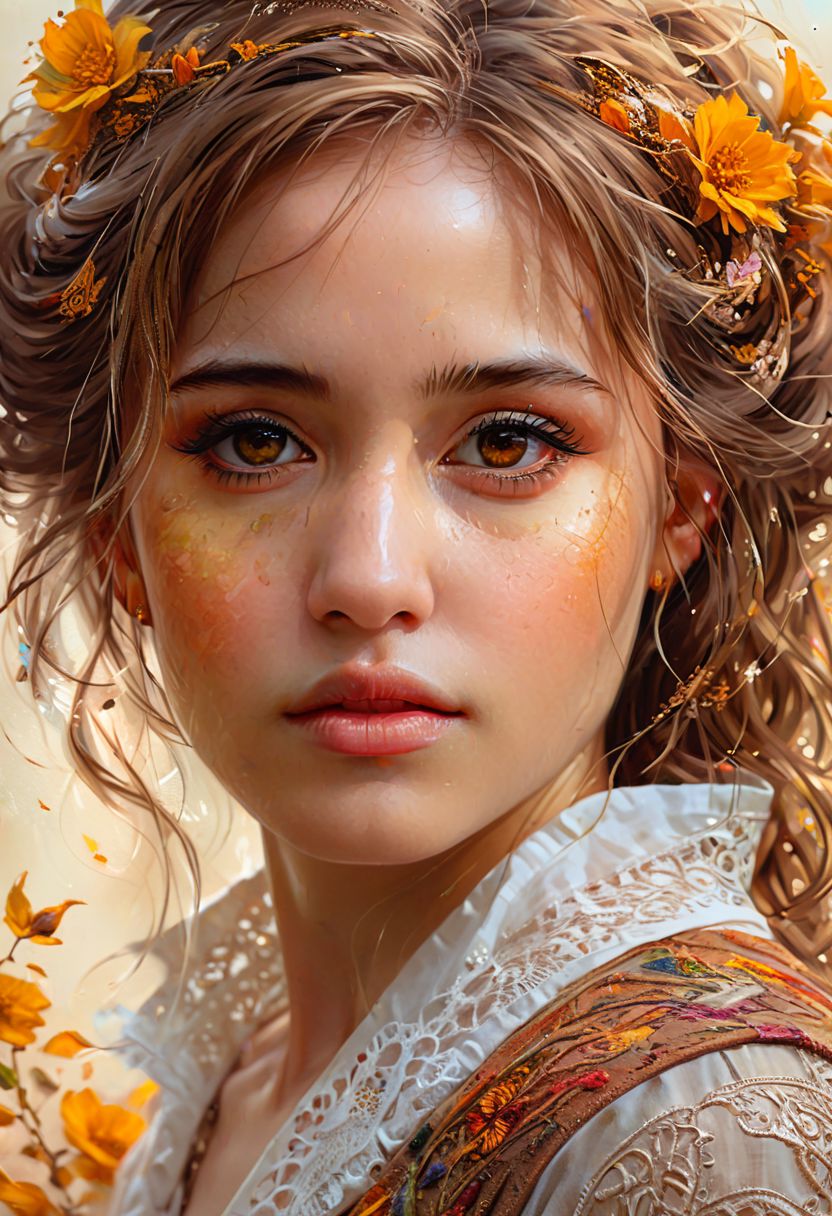 Portrait of Hermione Granger, brown eyes, perfecteyes, by Awwchang and CGSociety and Carne Griffiths and James Christensen, intricate motiffs, intricate filigree, sunny day background, Lou Xaz,