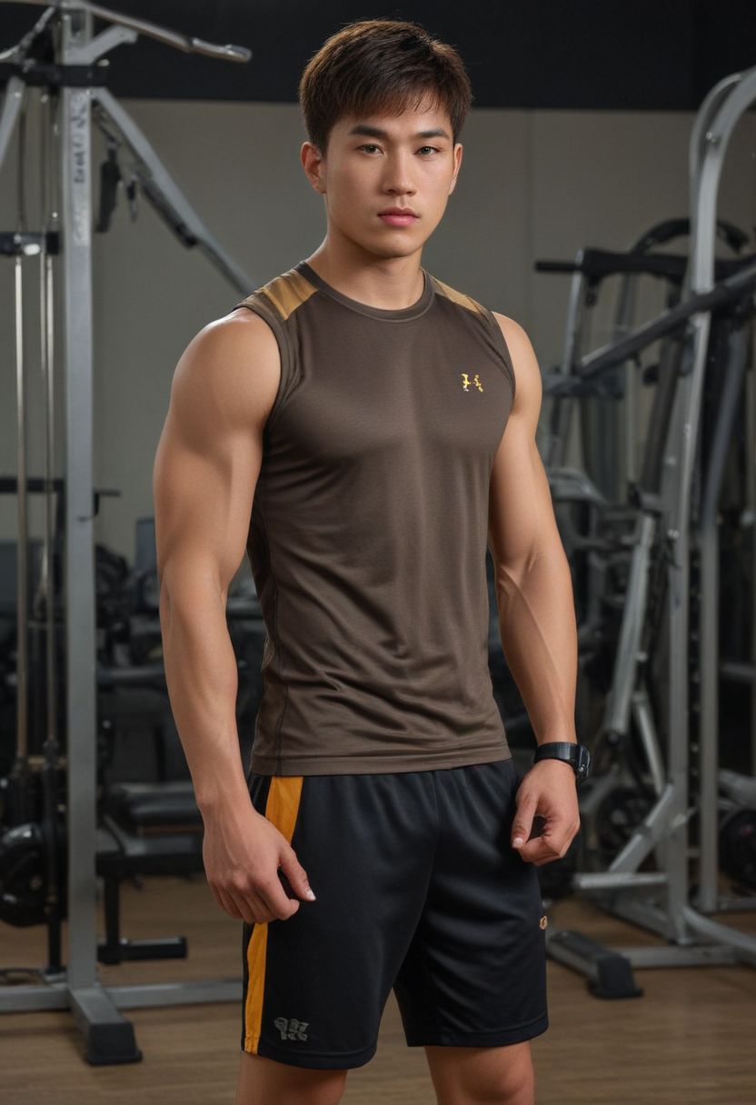 Masterpiece, night, soft amber Rembrandt lighting, photorealistic, sharp focus (((Round face))) 20 y/o male asian model, short hair cut, charming, athletics gym clothes, (full body:1.5)
