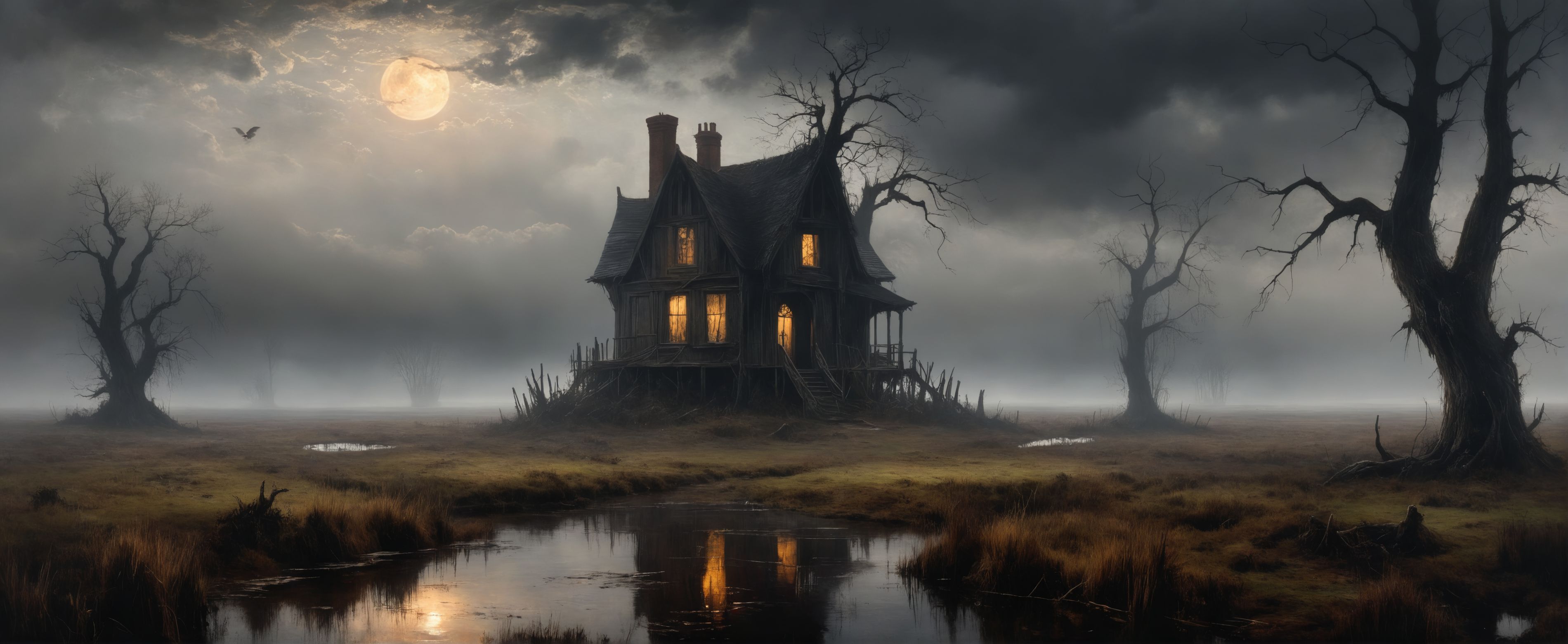 dreamscape gothic style horror-themed landscape shot with (A mist-covered marshland where twisted trees reach out like skeletal fingers towards the sky. Will-o'-the-wisps lead travelers astray, while the croak of frogs and the distant howl of wolves create an atmosphere of foreboding. A solitary hut sits on the edge of the marsh, its windows aglow with an otherworldly light.) <lora:John Constable Style:1.3> john constable style, painting, landscape, <lora:RMSDXL_Creative:0.8>. Scenic, outdoors, grand, beautiful . eerie, unsettling, dark, spooky, suspenseful, grim, highly detailed . dark, mysterious, haunting, dramatic, ornate, detailed . surreal, ethereal, dreamy, mysterious, fantasy, highly detailed