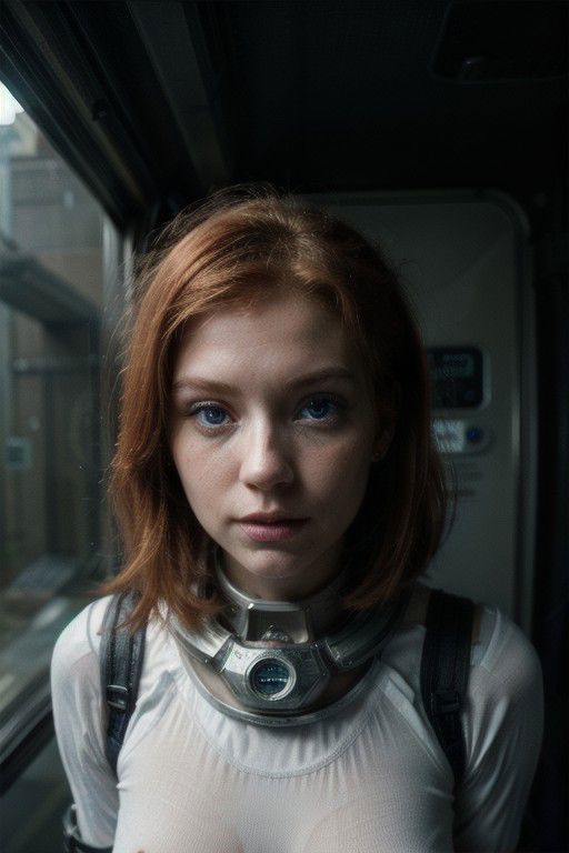 photo of a ginger woman, in space, futuristic space suit, (freckles:0.8) cute face, sci-fi, dystopian, detailed eyes, blue eyes