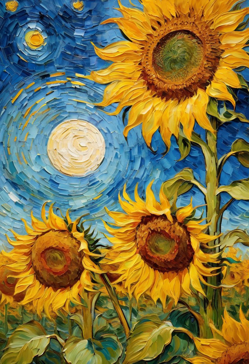impressionist painting by Van Gogh, very rough painting with visible paint strokes, (dynamic_angle), view from below, epic composition, golden composition, crescent moon, sunflower field