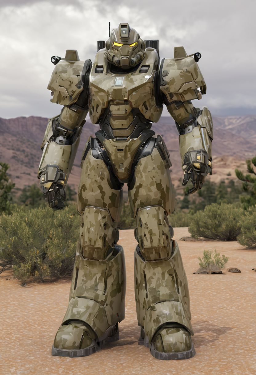 masterpiece, absurd resolution, 8k, power armor, ((best quality)),((masterpiece)),((highres)),((detailed)), original, full body, 1boy, mecha, power armor, armor, heavy armor, solo, standing, sky, cloud, armor, fir trees, science fiction, realistic, military, detailed, (Desert Camouflage paint job), blond hair