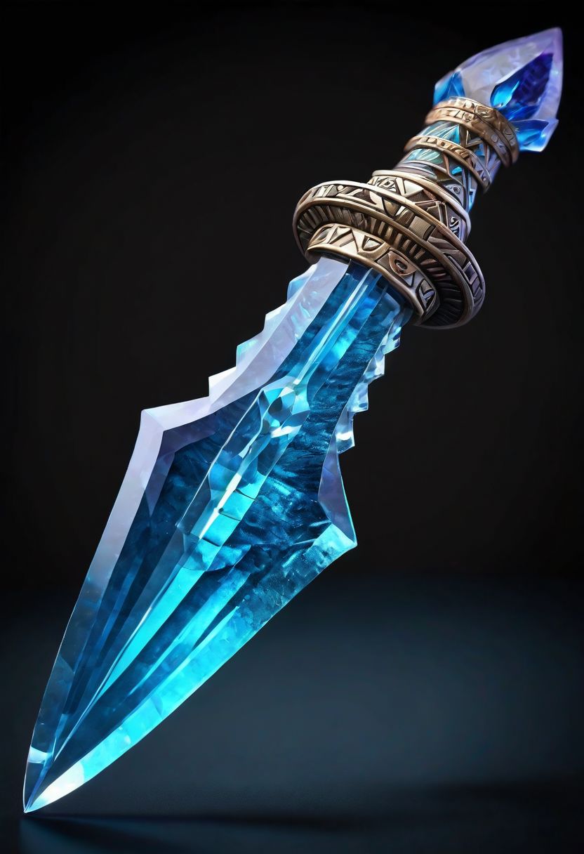(((Aztec style))), Tribal style, shaman style, Hyper-realism, HDR, detailed, intricate, side view, closeup side view, Purpure-blue crystal diamond war-dagger, translucent glass, facets, highlights, epic RPG game item, mythical technology, artisan, texture, simple black background