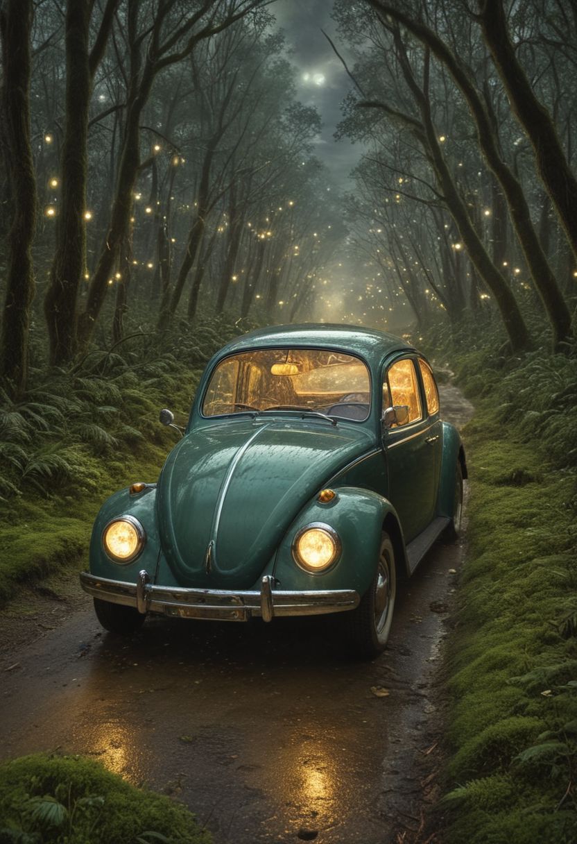 painting of a car driving down a road with lots of lights on it, an airbrush painting by david b. mattingly, cg society contest winner, retrofuturism, flying beetles, swarm of fireflies, beetles running through the moss