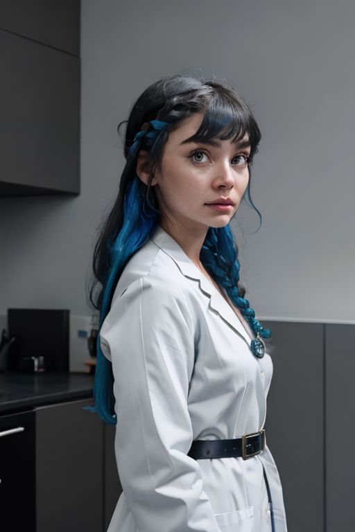 close-up, [sunafukitabito:sam yang:0.4], 90s flash photo masterpiece, best quality, civitai-chan, blue braided bangs, labcoat, shirt tucked in, single vertical stripe, black skirt, pencil skirt, pantyhose, necklace, belt indoors, upper body, looking at viewer, indoors, dark room, black background, arms at sides, close-up