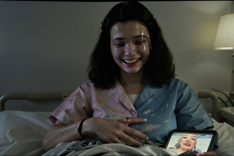 color, Grainy movie still from an (American) movie of science fiction book-cover painting of woman near a hospital bed with many electronic devices attached to her skull and fingers, woman is smiling crying wincing, bright harsh lighting