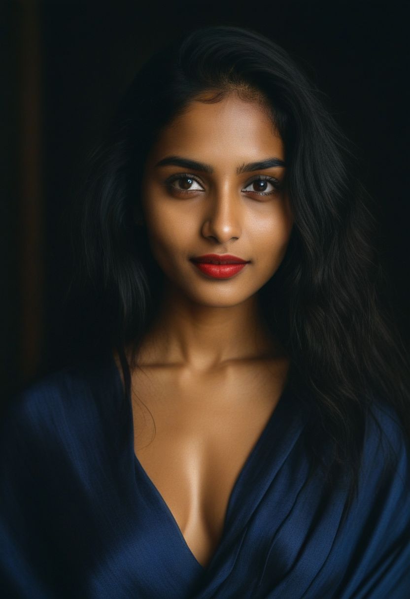 (close up, Face portrait, editorial photograph of a 30 year old dusky brown indian woman with long black hair), long oval shaped face, red lipstick, (highly detailed face:1.4) (smile:0.7) (background inside dark, seductive posture, moody, private study:1.3) POV, by lee jeffries, nikon d850, film stock photograph ,4 kodak portra 400 ,camera f1.6 lens ,rich colors ,hyper realistic ,lifelike texture, dramatic lighting , cinestill 800, natiral light from windows, woman with heavy breasts and clevage, full wet, with long flowing hair, black eyes, with flowing capes, c-cup breast, wearing silk saree, perfect composition, hyperrealistic, super detailed, 8k, high quality, trending art, trending on artstation, sharp focus, studio photo, intricate details, highly detailed, looking at the Camera, lusty look, brown skinned, natural makeup, dramatic ligting, red lips, Dusky brown skinned woman, detailed skin texture, seductive look, chubby boddy, huge Clevage visible, low angle shot, bended posture,