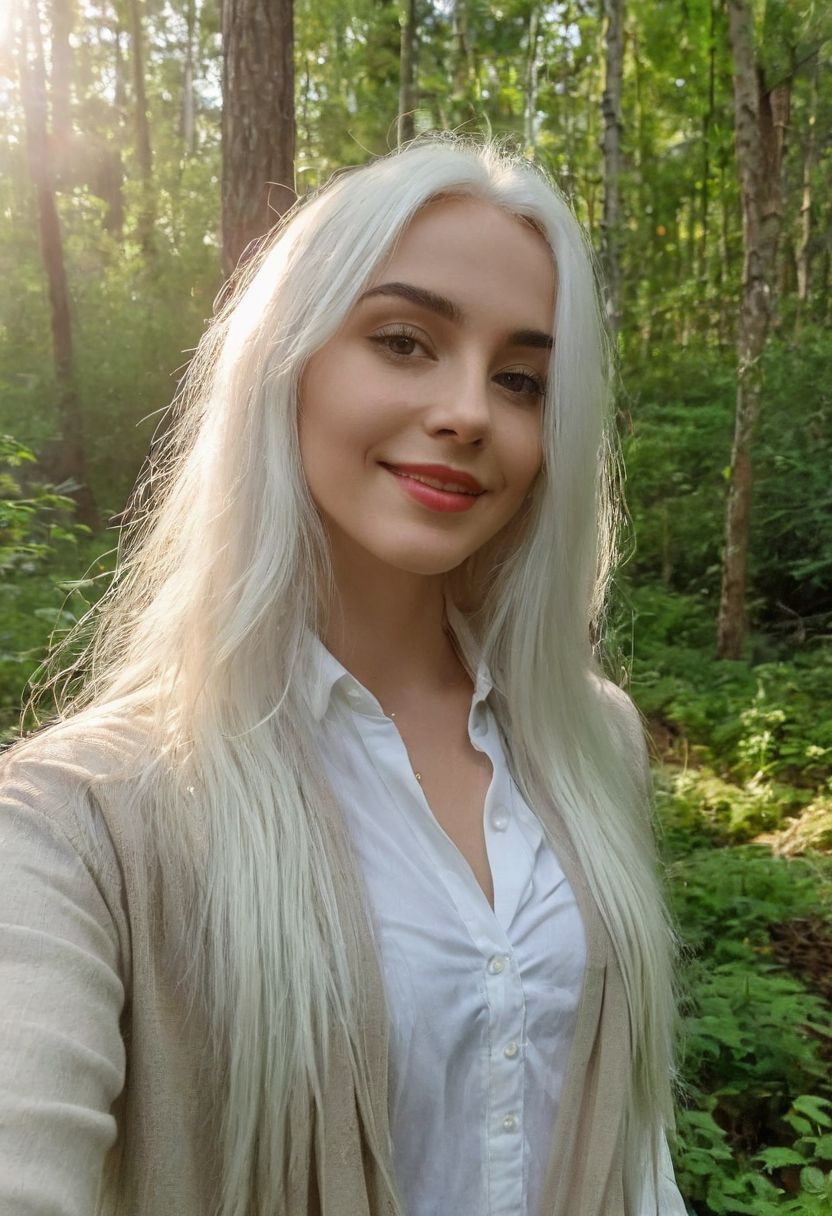 , selfie, photo, full-length body, evening light, elf, green tattoos on her body, dressed in a light white stole, in the thicket of the forest, around the early morning light of the sun, 18-year-old girl, slender, ((strict facial features)), square face shape, long white hair, deep cleavage, visible halos,athletic physique, slim waist, smiling maliciously, bright colors, lively background, flaws, static photos of 2024, photos, found footage shot on an iphone,