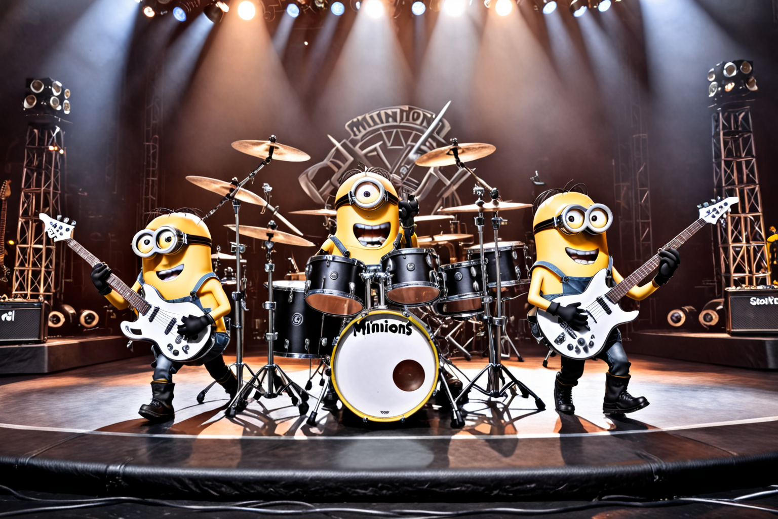 anime artwork high resolution, photo of a froup of minions as a metal band, black leather, guitar, rock´n´roll, drumms, on a stage, stage lights, <lora:add_detail:1> <lora:RMSDXL_Darkness_Cinema:1> . anime style, key visual, vibrant, studio anime, highly detailed