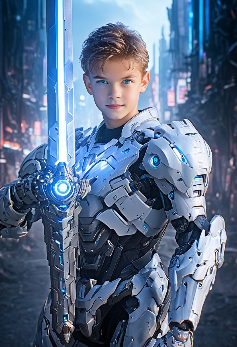 (sci-fi, 1boy:1.5, wearing mecha armor, happy face, beautiful hair, looking at viewer, blue eyes, holding a glowing sword), sci-fi background, hkmecha, realistic, real