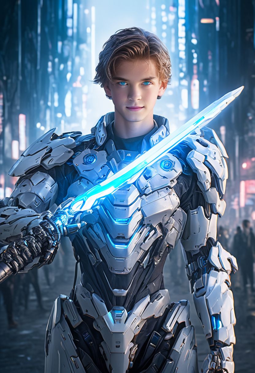 (sci-fi, 1boy:1.5, wearing mecha armor, happy face, beautiful hair, looking at viewer, blue eyes, holding a glowing sword), sci-fi background, hkmecha, realistic, real