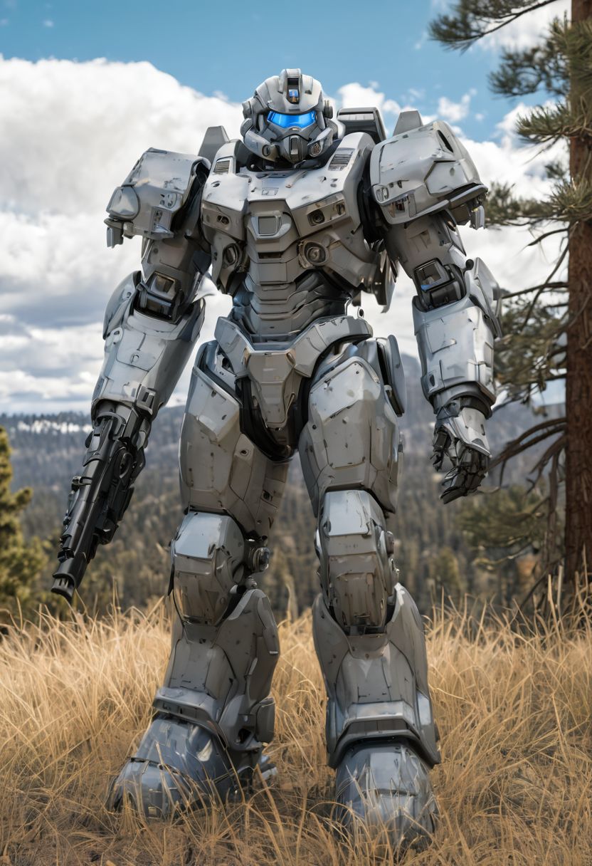 masterpiece, absurd resolution, 8k, power armor, ((best quality)),((masterpiece)),((highres)),((detailed)), original, full body, 1boy, caucasian, blond hair, blue eyes, mecha, power armor, armor, heavy armor, solo, standing, sky, cloud, armor, pine trees, dry grass, science fiction, realistic, military, detailed, (Desert Camouflage paint job),