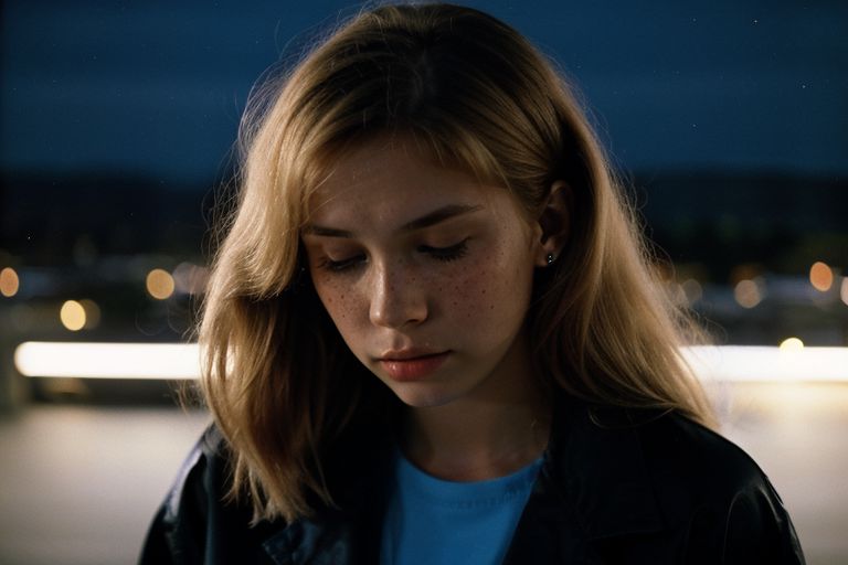 sharp, detailed, film still, A 18yo (blonde) girl with light freckles, thinking of you as her lover, looking down, aroused, shy, film grain, dimly lit, dark lighting, midnight, night time, dark, blue color tone, style by 1980s, no monitor, ambient blue light, (panchromatic), (NIKON FA), ((1988)), (1980s colors), (1980s styles), retro, nostalgic,