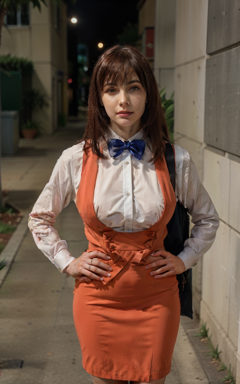 ((masterpiece, best quality)), insaneres, absurdres, solo, looking at viewer, BREAK OrangeSuit_Lingeries_RenaAsaoka_ownwaifu, 1girl, brown hair, red eyes, long hair, lipstick, earrings, makeup, lips, bangs, hair between eyes, large breasts, shiny hair, orange vest, name tag, vest, blue bow, long sleeves, pencil skirt, bowtie, see-through legwear, formal, white shirt, office lady, (contrapposto, hand on hip), sunset, sidelighting, outdoors, <lora:FAP_CHR_Lingeries_RenaAsaoka_ownwaifu:1> , depth of field ,