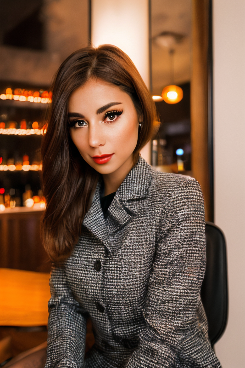 <lora:SC-LunaRexx:0.85>, photo of lunarexx, sitting, on chair, happy, drinking a cocktail in a bar, shirt, suit, fancy clothes, formal clothes, intricate realistic photo, makeup, detailed eyes, (epicPhoto), (looking at viewer), (cinematic shot:1.3), epiCRealism, epiCPhoto