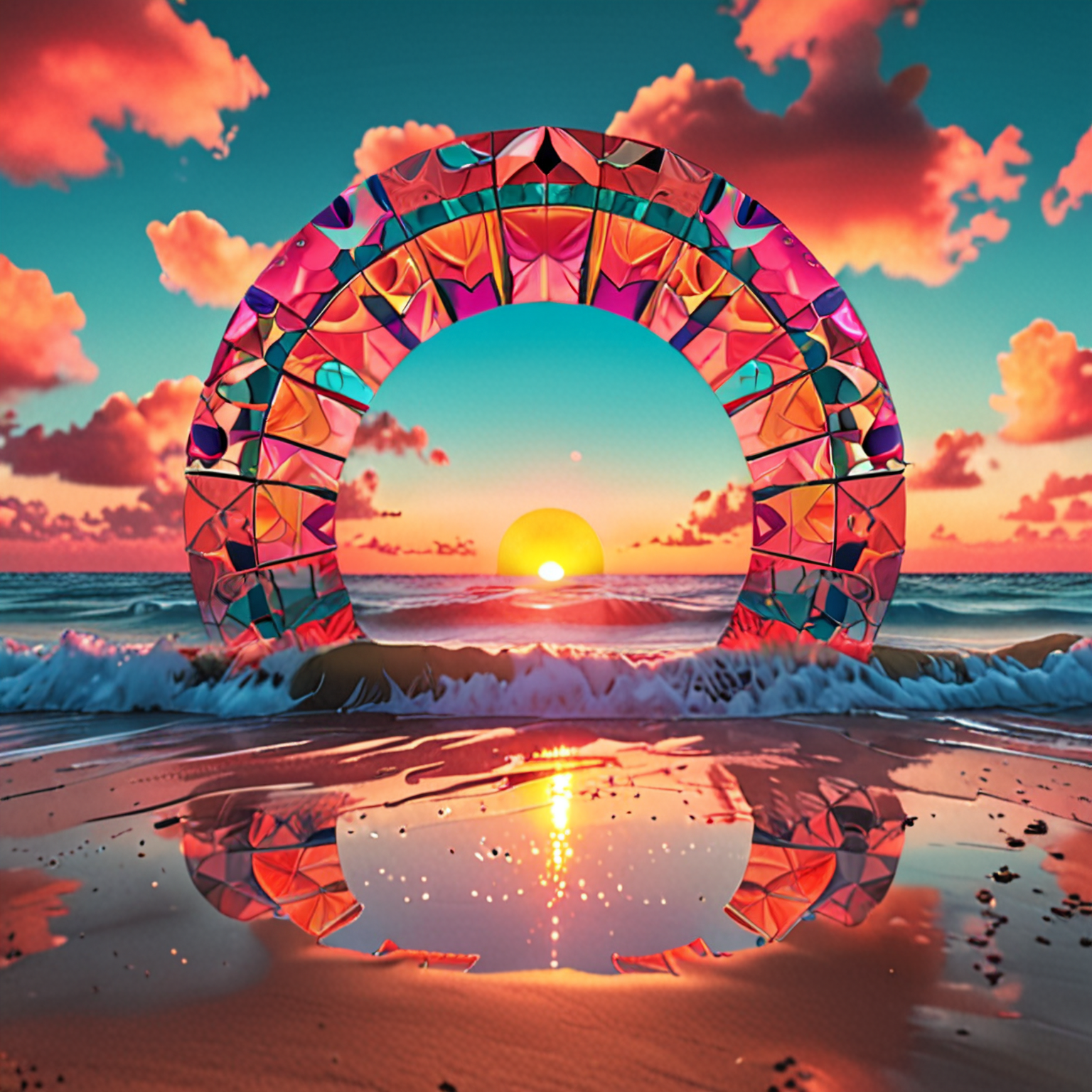 A mesmerizing digital art wallpaper featuring a multiframed kaleidoscope with countless little pictures and collages. The aesthetic of the artwork is a vibrant, eclectic mix of vaporwave elements, with a color palette that includes bright neon hues and pastel shades. The background is a stunning beach scene, with the sun setting over the ocean, casting a warm glow on the sand. The overall effect is a captivating, eye-catching design that invites viewers to dive into its virtual world.