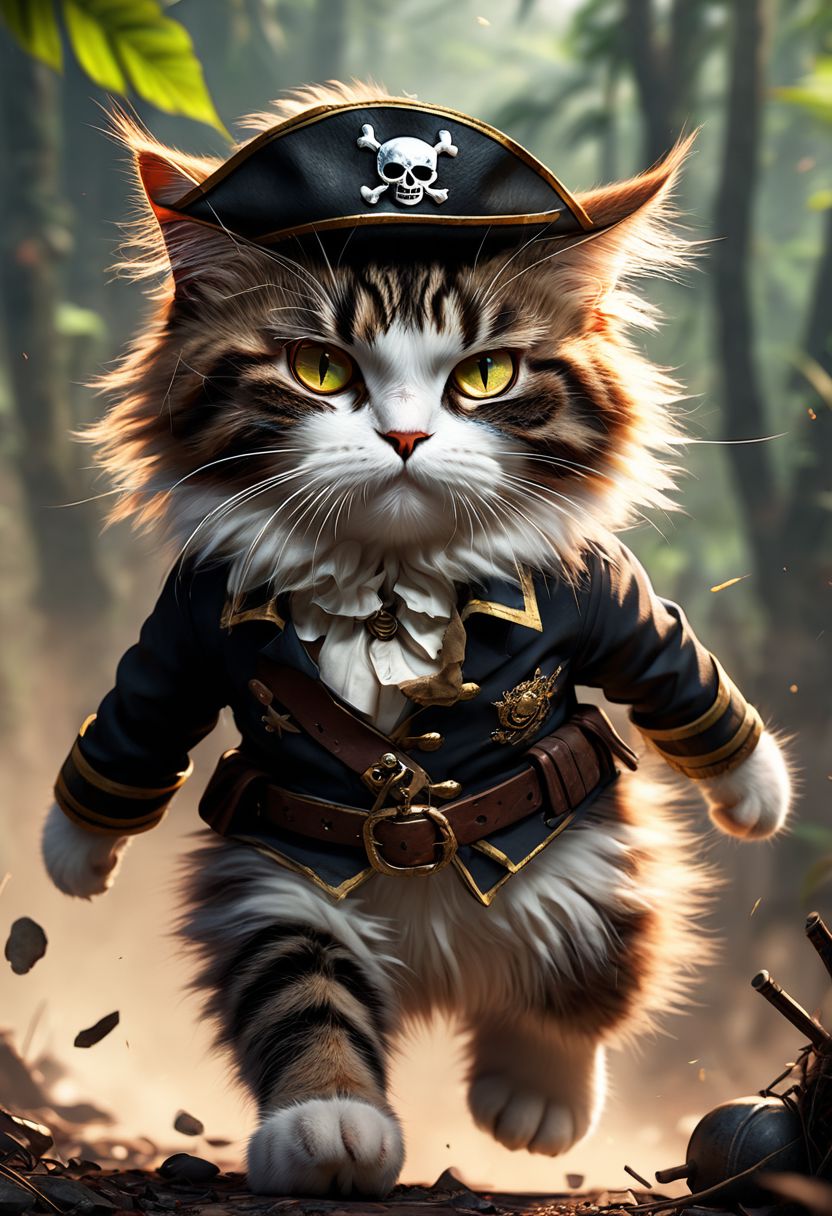 adorable fluffy cat pirate eyepatch, Scene from Rambo movie, cat with The granade in the jungle, explosion, action scene, war chronicles, award winning masterpiece 8k artstation