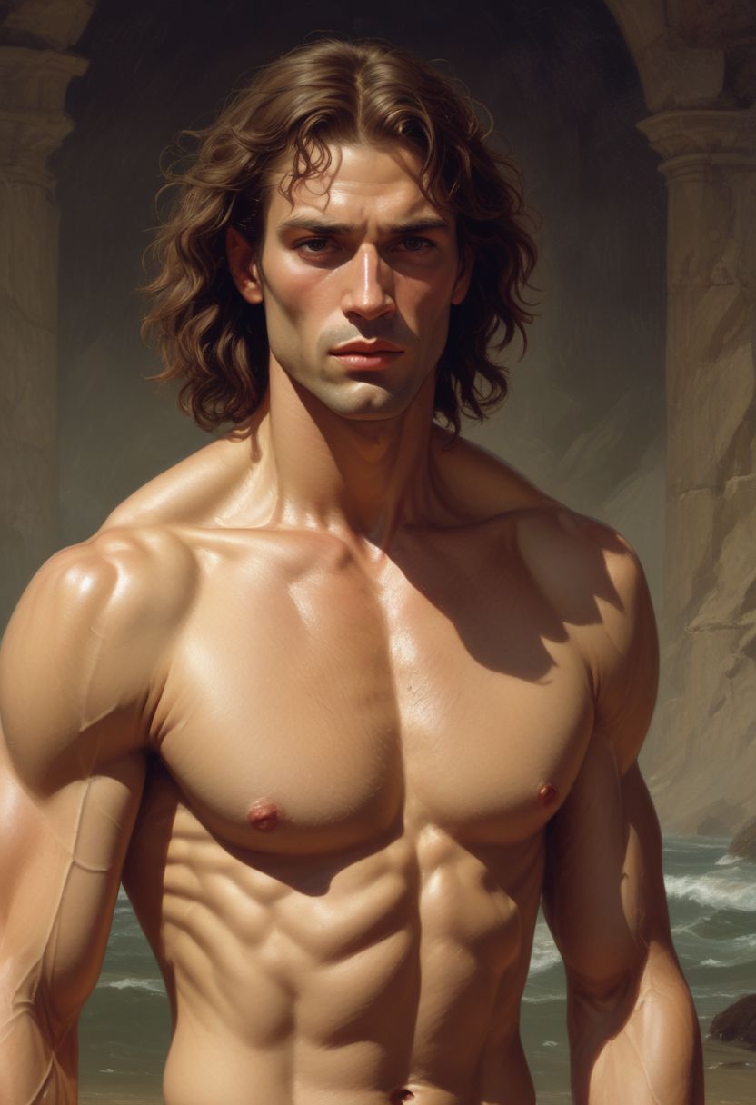 Portrait of a Miniscule Muscular slender Pained male medieval human with Uneven Yellow eyes, Waist-length tan Brown Wavy hair, tawny Brown skin, Round face, Lumpy forehead, downward curve eyebrows, Round cheeks, Roman nose, Perfect teeth, and Prognathus chin, art by jock sturges and Jeff Easley