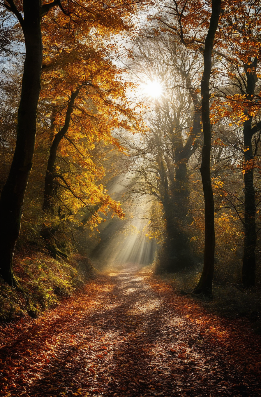 photograph, a dark path in the woods with leaves and the sun shining , by Julian Allen, dramatic autumn landscape, ears, park, take off, peace, rich cold moody colours, hi resolution, oaks, <lora:add-detail-xl:1.2>, <lora:zavy-cntrst-sdxl:0.4>