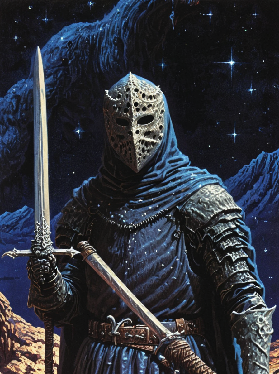 1970's dungeons and dragons dark fantasy artstyle, a hooded knight, bone mask, dark armour, sword in hand, prepared to fight a massive cuthulu, starry sky , grain, cinematic, realistic, photo <lora:dark_fantasy-000013:1>