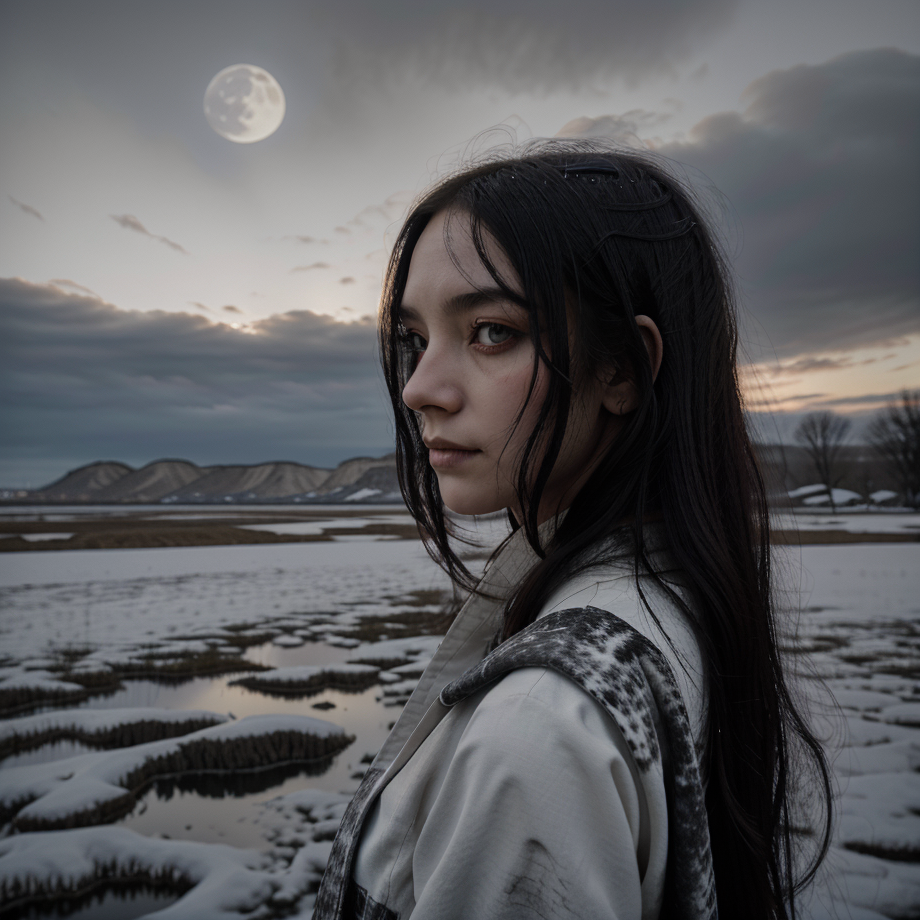 1 girl, skull head, realistic, colorful hair, fantasy dress, black_hair, utdoors, sky, cloud,moon, scenery, fantasy, In a desolate, shadowy wasteland, a lone figure trudged through the ashen landscape, the air heavy with an ominous silence., scene view, dynamic angle, <lora:style-1-v4-200:0.6>,bailing_eastern ,snow,outdoors,red eyes,long hair,snowing,from behind,White dragon,Charcoal Drawing architecture Dystopian Cityscape Tidal Flat,Dusk,Leeches,Rustling Leaf