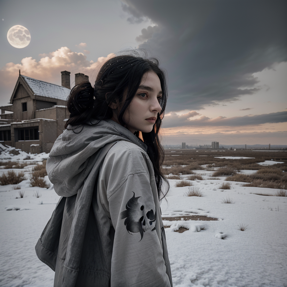 1 girl, skull head, realistic, colorful hair, fantasy dress, black_hair, utdoors, sky, cloud,moon, scenery, fantasy, In a desolate, shadowy wasteland, a lone figure trudged through the ashen landscape, the air heavy with an ominous silence., scene view, dynamic angle, <lora:style-1-v4-200:0.6>,bailing_eastern ,snow,outdoors,red eyes,long hair,snowing,from behind,White dragon,Charcoal Drawing architecture Dystopian Cityscape Tidal Flat,Dusk,Leeches,Rustling Leaf
