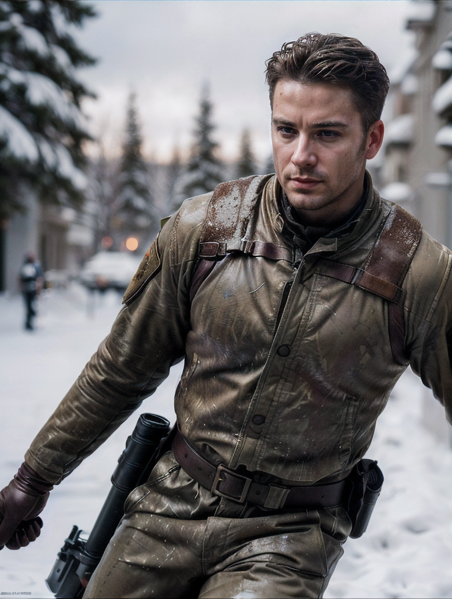 cinematic film still a award winnig photo of a male Guard in motion in tundra, , action sequence, weapon, <lora:add_detail:1>, ((best best quality)), ((masterpiece)), ((realistic)), (detailed), , highly detailed skin, blush, (masterpiece), absurdres, HDR , . shallow depth of field, vignette, highly detailed, high budget Hollywood movie, bokeh, cinemascope, moody, epic, gorgeous, film grain, grainy