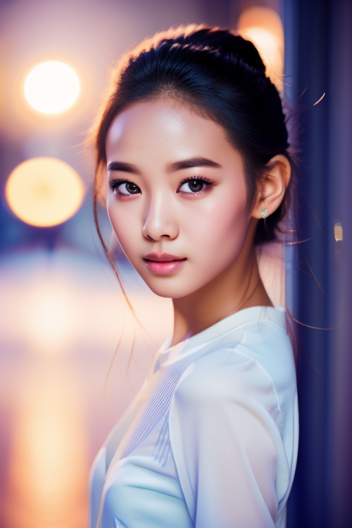 a stunning portrait of a radiant alien girl bo canon 5D, cinematic lighting, bokeh, shallow depth of field, light rays, blue hour, edge-lit <lora:epiCRealismHelper:1> <lora:bo_20230920135652:1>