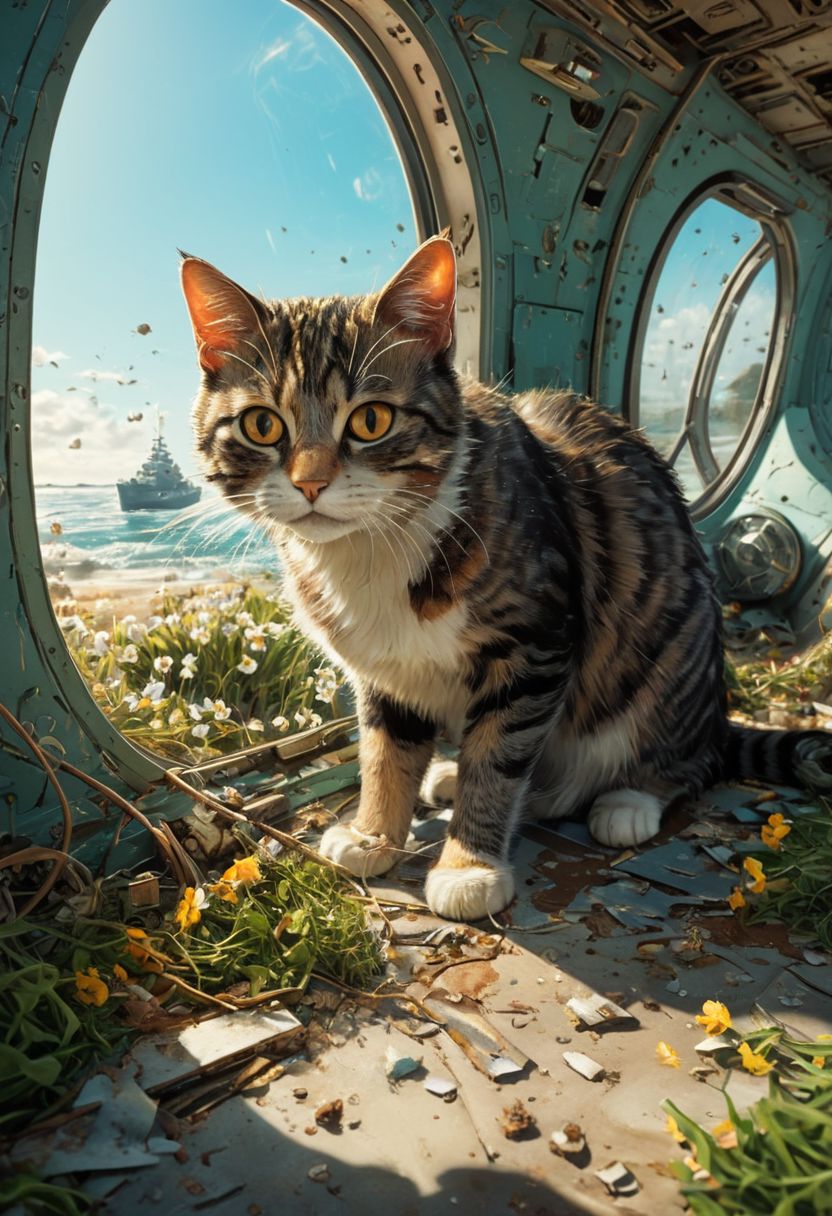 NSFW, photorealistic, by Greg Tocchini, photo of a cat inside a destroyed badly damaged space ship in a beautiful beach, Cats running around:1.5, (Broken windows, broken body, spare parts scattered nearby.) Grass and flowers grow around it. Sunny summer day. ocean. Calm and beautiful. Detailed art, many details, cute, adorable, fairytale, storybook detailed illustration, cinematic, ultra highly detailed, beautiful details, vibrant colors, complex background, fine art, best quality, hyper detailed, professional poster art, bold lines, award winning, trending on ArtStation , (intricate details, masterpiece, best quality:1.4), looking at viewer, dynamic pos, in the style of nicola samori