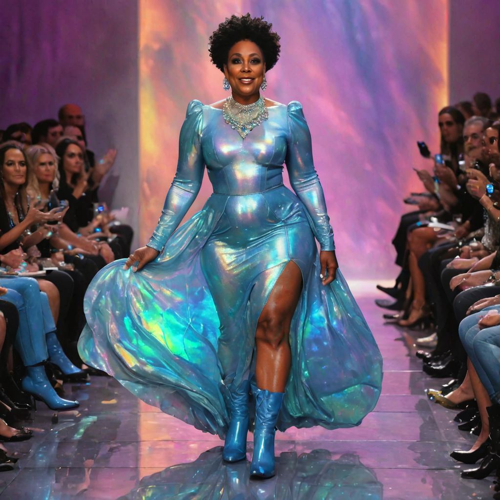A 40 year old black woman weighing 280 pounds wearing a iridescent opal dress that goes down to her ankles, long dress, delicate design, intricate design, colorful design, masterpiece fashion design, wearing a pearl necklace, wearing blue leather boots, at a fashion show