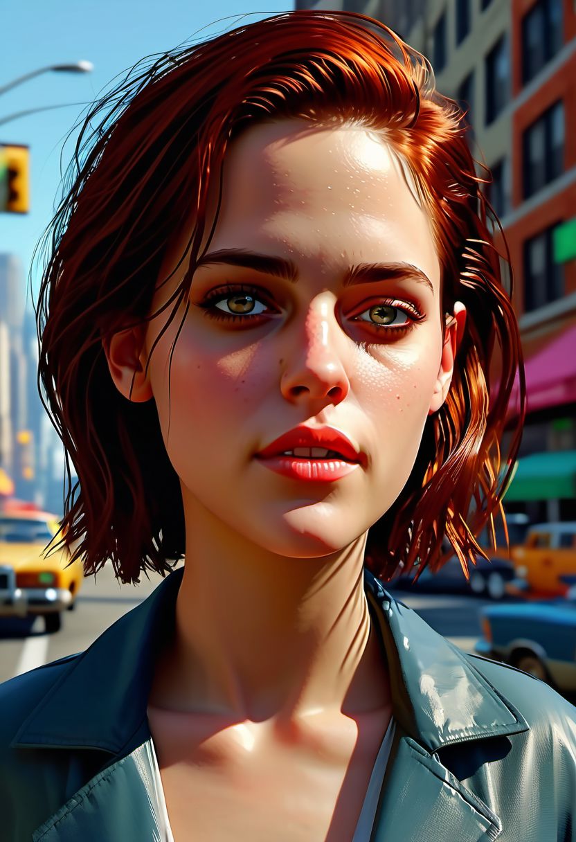 "Grand Theft Auto Five" style. "Kristen Stewart". In a "Grand Theft Auto Five Loading Screen" aesthetic. Stares the viewer. Subtle smile. Strong expression. Confident. Hip-Hop outfit. By "Simon Stalenhag". Life-like details. Cinematic. Dramatic. Dynamic. Extremely refined lines and and shapes. Extremely refined details on objects. Sharp details. Wide range of colors. Many details everywhere. Ray-Tracing. Anti-Aliasing. Realistic soft shadows. Low saturation colors. Insane quality. Insane resolution. Insane details. Masterpiece. 32k resolution.