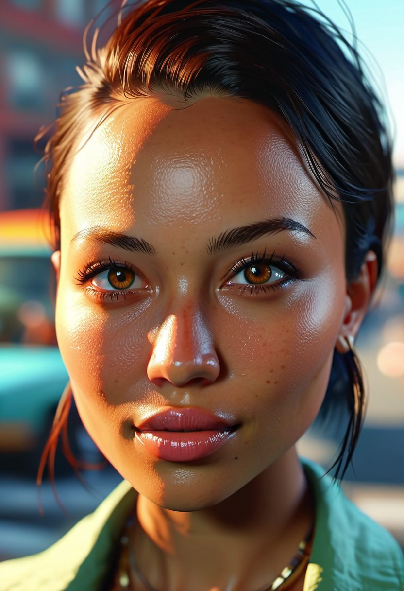 "Grand Theft Auto Five" style. "Levy Tran". In a "Grand Theft Auto Five Loading Screen" aesthetic. Stares the viewer. Subtle smile. Strong expression. Confident. Hip-Hop outfit. By "Simon Stalenhag". Life-like details. Cinematic. Dramatic. Dynamic. Extremely refined lines and and shapes. Extremely refined details on objects. Sharp details. Wide range of colors. Many details everywhere. Ray-Tracing. Anti-Aliasing. Realistic soft shadows. Low saturation colors. Insane quality. Insane resolution. Insane details. Masterpiece. 32k resolution.