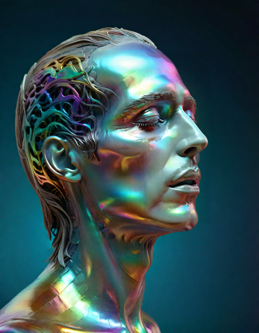 schizophrenia man profile, flat 3d digital art, (volumetric iridescent:1.3), psychedelic aesthetics, (closed eyes:1.5), (closed mouth:1.5), best quality, high quality, masterpiece, highres, <lora:xl_more_art-full_v1:0.7>