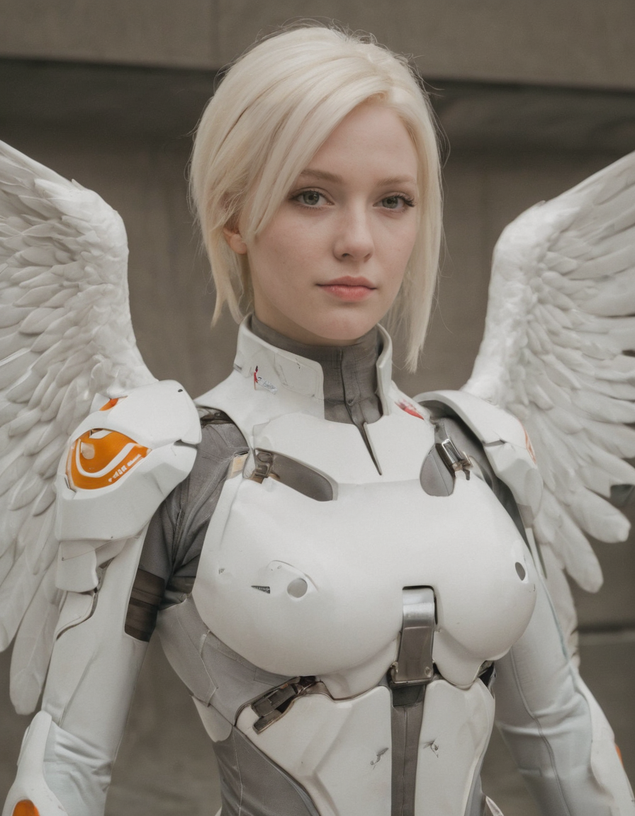 a close up of a woman with wings, mercy from overwatch game (2016) , heavily upvoted, before and after, one angel, one blonde, stock image, ambulance, anime visual of a young woman, diverse medical cybersuits, bald lines, 7 7 7 7, albino, Nikon D750, 32k, Megapixel, HDR, Leica 50mm lens, Kodak Portra 800 film