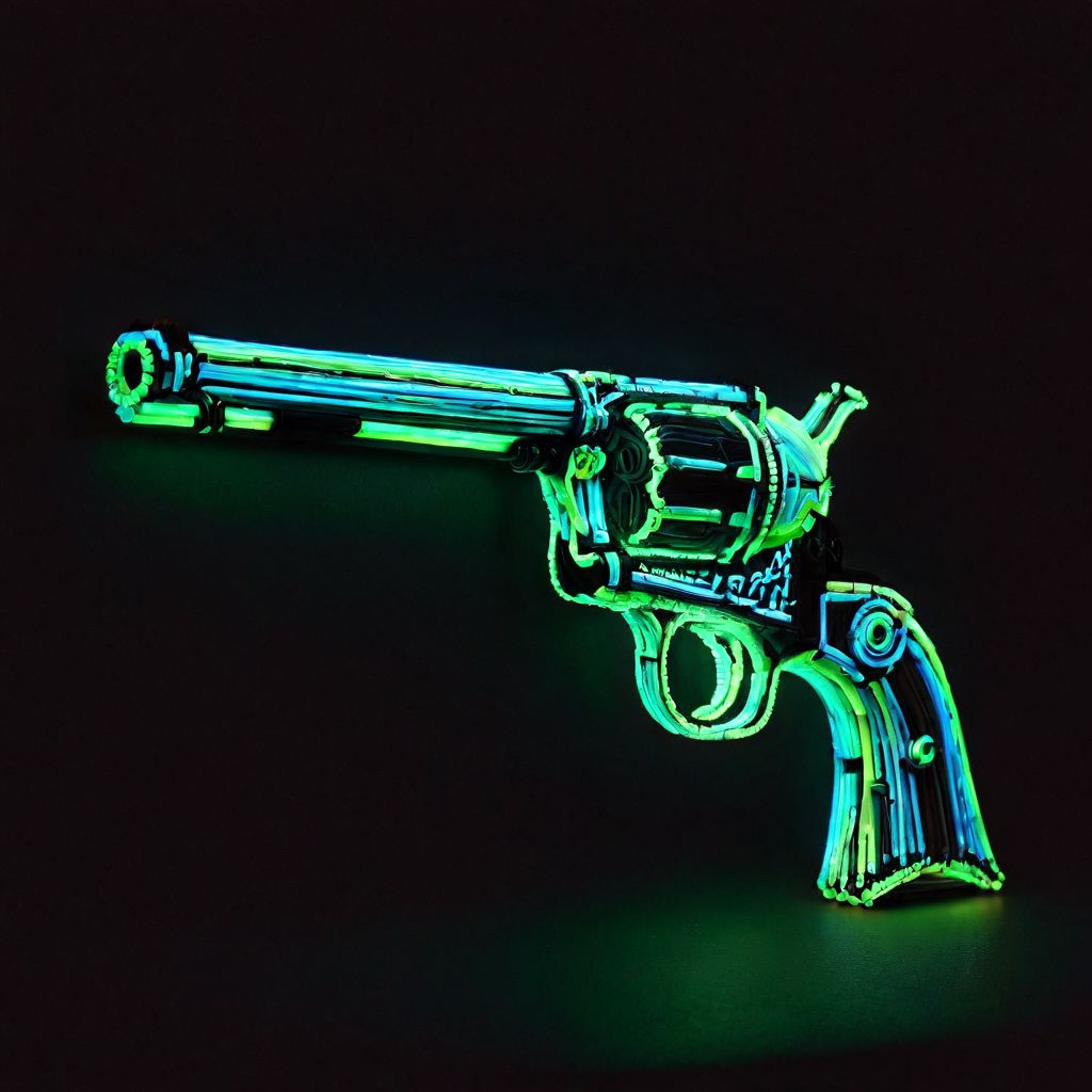 mad-glowstick single_action colt revolver handgun in a detailed oak display_case, radioactive glow, grips are constructed from intricately weaved glowsticks, High contrast, (midnight_lighting), hard shadows, intricate detail, 8k, perfect, perfection style, Dark background allowing for optimized luminescent