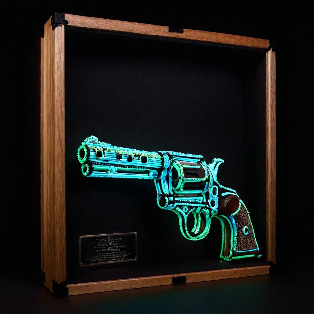 mad-glowstick single_action colt revolver handgun in a detailed oak display_case, radioactive glow, grips are constructed from intricately weaved glowsticks, High contrast, (midnight_lighting), hard shadows, intricate detail, 8k, perfect, perfection style, Dark background allowing for optimized luminescent