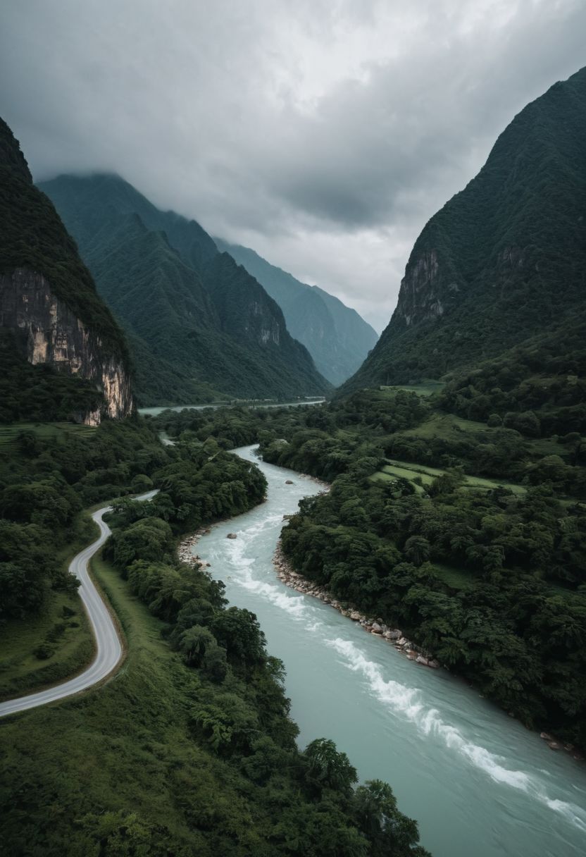 The scene captured by the Sony A7IV with a 20mm G Master lens set at a wide aperture of F1.5 unfolds with haunting beauty, enveloped in a moody and melancholic atmosphere landscape with sleeping beauty mountains far away along with river